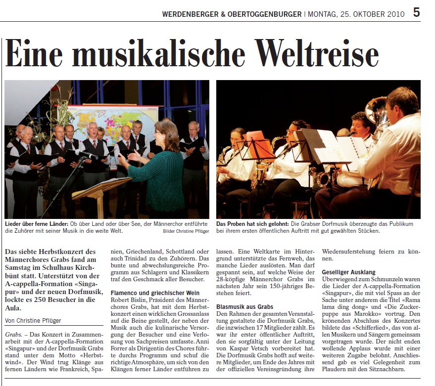 Samstg 23. Oktober 2010 Herbstkonzert in Aula Kirchbünt, Grabs Mitwirkende: MC Grabs, A-Capella-Formation Singapur, Grabser Dorfmusik