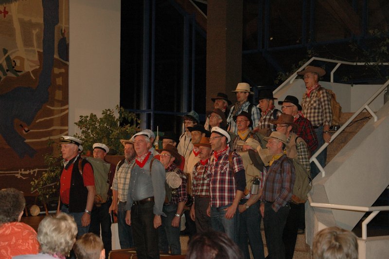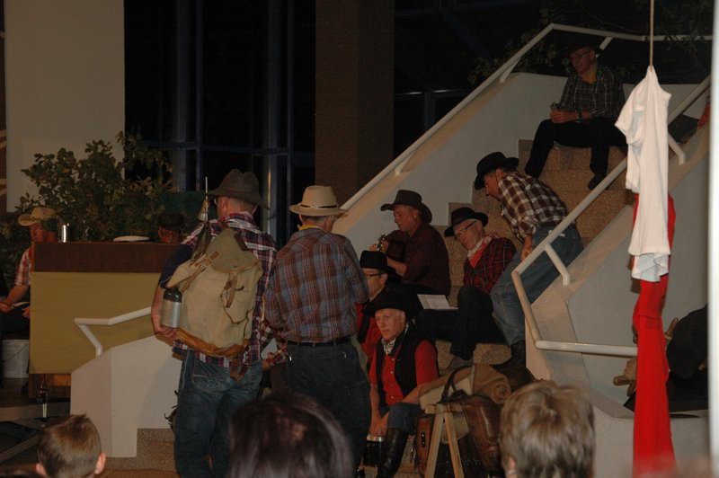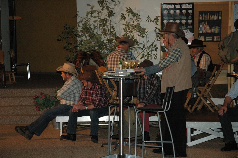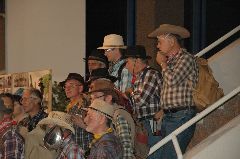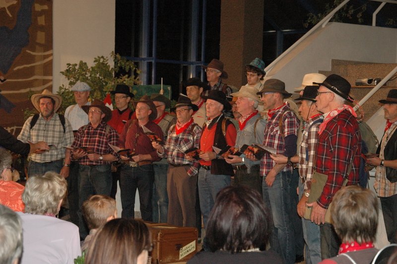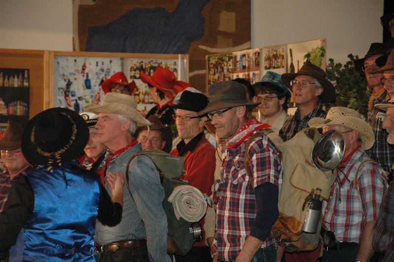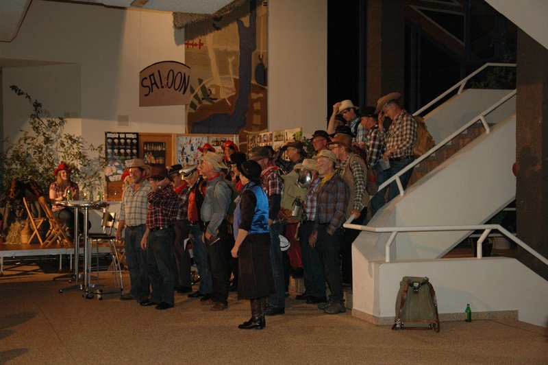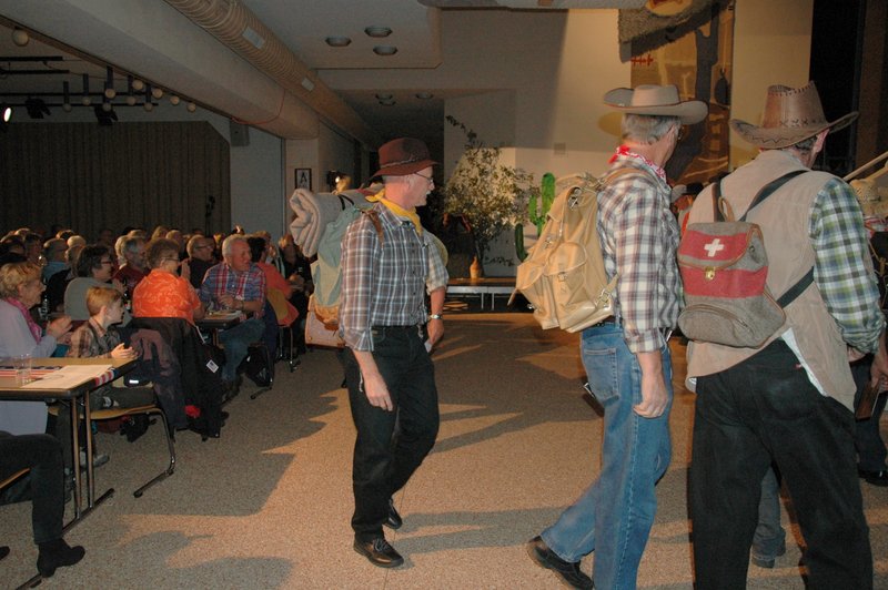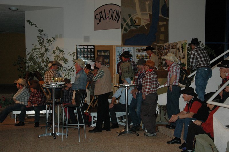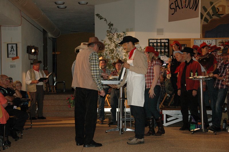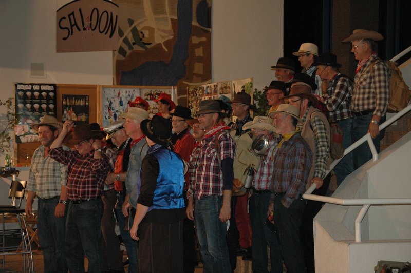 "Wildwest" - Singspiel des Männerchors Grabs Die Grabser Männerchörler gehen auf Reisen, nach Amerika in den "Wilden Westen". Nicht mit dem Flugzeug, wie dies heute Mode ist, sondern in altbewährter Manier mit dem Schiff. Doch schon bei der Ankunft in der Neuen Welt gibts die ersten Probleme mit den Gesetzeshütern, sei es wegen des Grabserschnapses im Gepäck, oder sei es wegen missverstandener Streiche im Hafenviertel. Dann ziehts die Männer weiter in den Westen. Hoch zu Pferd gehts durch die Prärien, übernachtet wird am Lagerfeuer, und hin und wieder wird im Saloon abgestiegen für einen Drink oder zu einer Show mit den Country Dancers. Natürlich wird auf dieser Reise auch viel gesungen. Bald naht jedoch der Tag der Heimkehr, die letzten Dollars werden noch für Drinks ausgegeben, und das Schiff bringt die Gesellschaft wieder zurück nach Haus. |