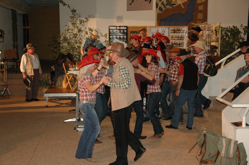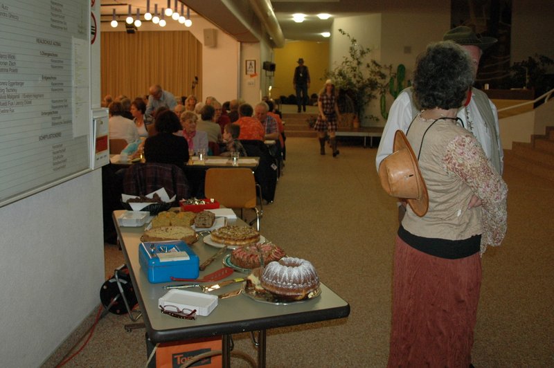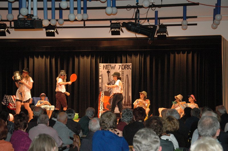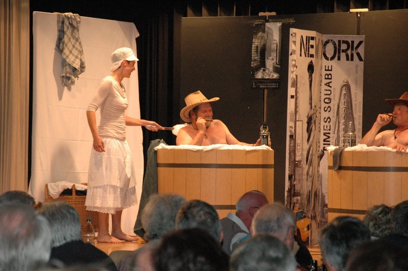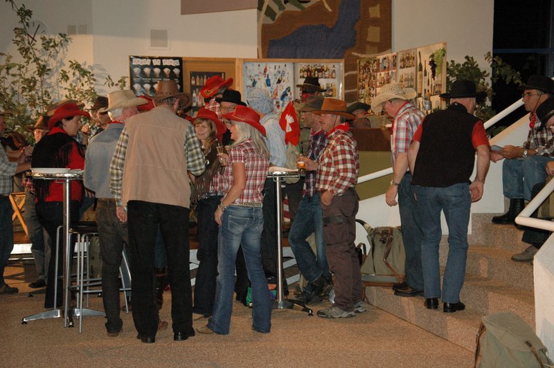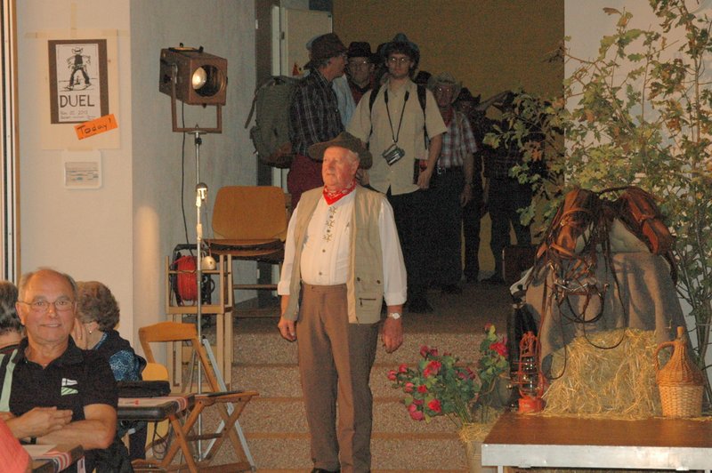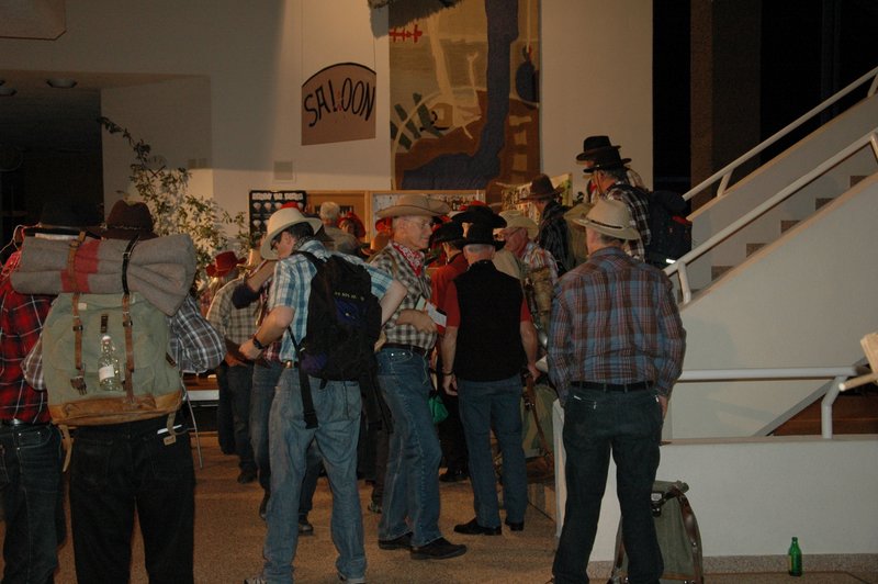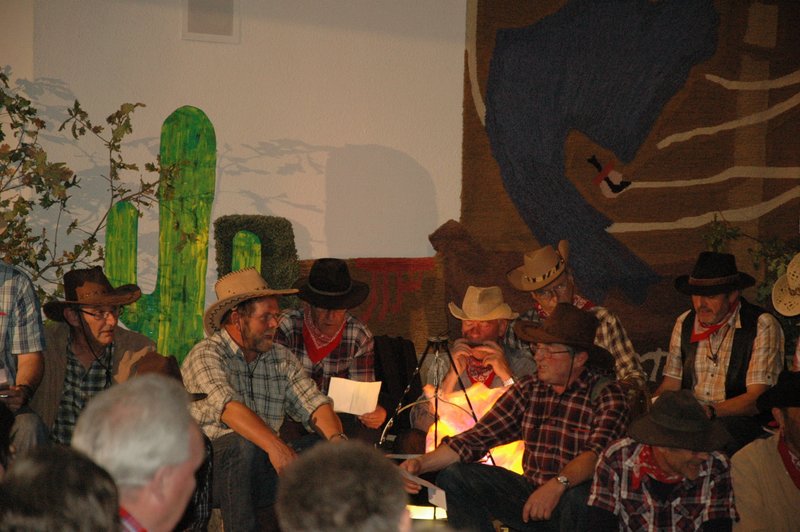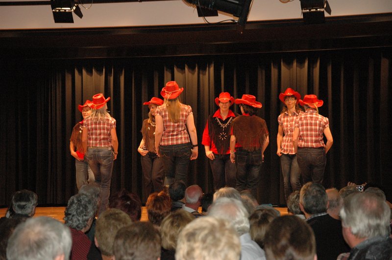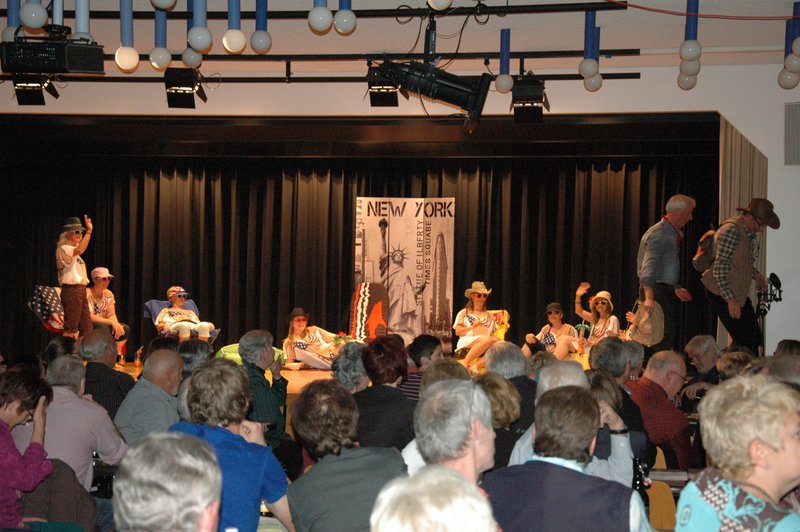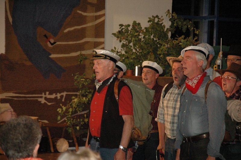 "Wildwest" - Singspiel des Männerchors Grabs Die Grabser Männerchörler gehen auf Reisen, nach Amerika in den "Wilden Westen". Nicht mit dem Flugzeug, wie dies heute Mode ist, sondern in altbewährter Manier mit dem Schiff. Doch schon bei der Ankunft in der Neuen Welt gibts die ersten Probleme mit den Gesetzeshütern, sei es wegen des Grabserschnapses im Gepäck, oder sei es wegen missverstandener Streiche im Hafenviertel. Dann ziehts die Männer weiter in den Westen. Hoch zu Pferd gehts durch die Prärien, übernachtet wird am Lagerfeuer, und hin und wieder wird im Saloon abgestiegen für einen Drink oder zu einer Show mit den Country Dancers. Natürlich wird auf dieser Reise auch viel gesungen. Bald naht jedoch der Tag der Heimkehr, die letzten Dollars werden noch für Drinks ausgegeben, und das Schiff bringt die Gesellschaft wieder zurück nach Haus. |