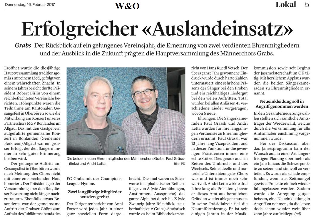 Wiederum durfte Präsident Röbi Bislin von einem reich befrachteten Vereinsjahr berichten. Höhepunkte waren die Teilnahme am kantonalen Gesangsfest in Oberbüren, sowie die Mitwirkung am Konzert unseres Partnerchors MGV Bonlanden im Allgäu. Letzteres wird uns immer in sehr guter Erinnerung bleiben. Und der trotz gelungenem Auftritt leider nicht ganz erreichten sehr guten Note am Gesangsfest sollen wir gemäss unserem Präsidenten nicht länger nachtrauern. Etwas Besonderes war der gemeinsame Auftritt der Grabser Chöre am Jubiläumsfest des FC, mit der Champions-League-Hymne.