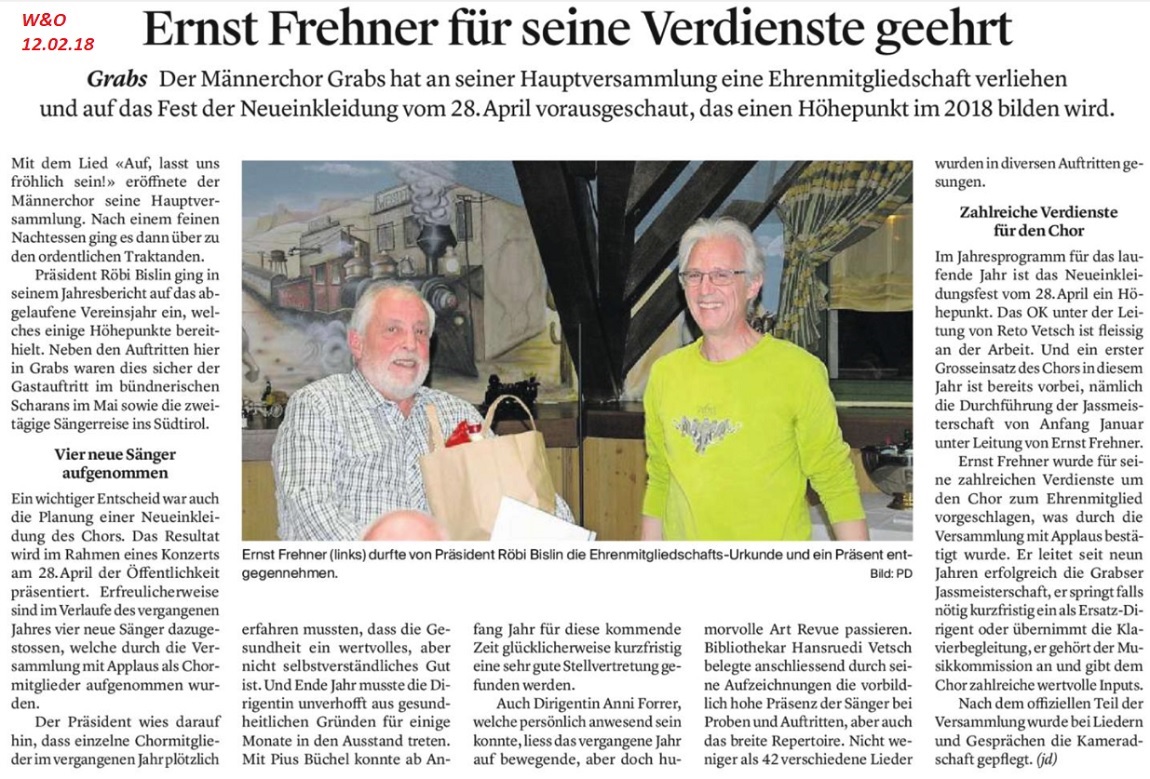 Im Jahresprogramm fürs laufende Jahr ist sicher das Neueinkleidungsfest vom 28. April ein Höhepunkt. Das OK unter der Leitung von Reto Vetsch ist fleissig an der Arbeit. Und ein erster Grosseinsatz des Chors in diesem Jahr ist bereits vorbei, nämlich die Durchführung der Jassmeisterschaft von Anfang Januar unter Leitung von Ernst Frehner. Ernst Frehner wurde für seine zahlreichen Verdienste um den Chor - Jassmeisterschaft, Vize-Dirigent oder Musikkommission sind nur einige davon - zum Ehrenmitglied vorgeschlagen, was durch die Versammlung mit Applaus bestätigt wurde. Herzliche Gratulation!