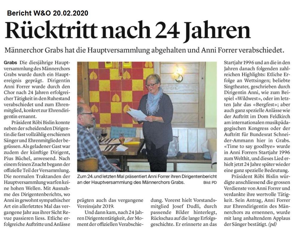 14. Februar 2020 Hauptversammlung des Männerchors im Thai-Grütli Verabschiedung Dirigentin Anni Forrer