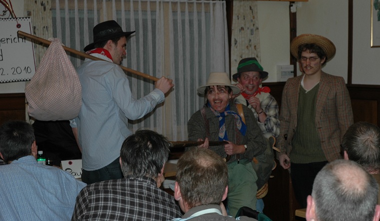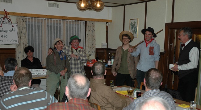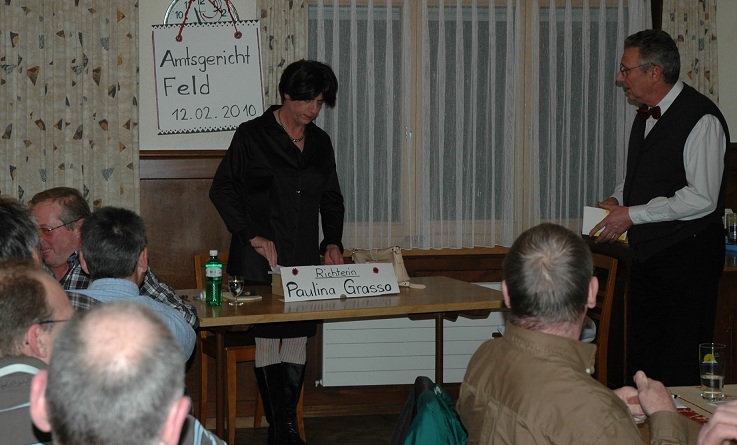 Nach dem offiziellen Teil und nach einem feinen Nachtessen aus der Trauben-Küche tagte schliesslich noch das „Amtsgericht Feld“ unter der Leitung der gestrengen Richterin Pauline Grasso, welche einige Vagabunden zu ihrer gerechten Strafe verurteilen wollte. Diese verteidigten sich alle bravourös in singender Form. Zum Ausklang pflegten die Männerchörler das freie Singen, begleitet von Pianist Ernst Frehner.