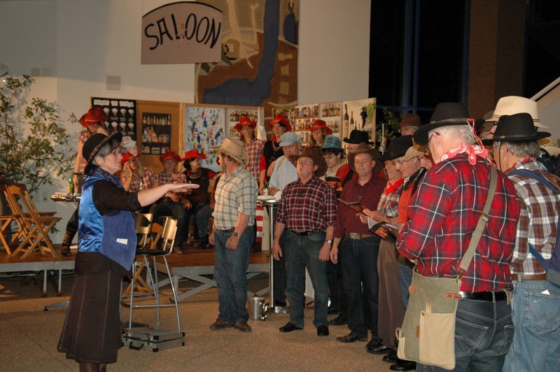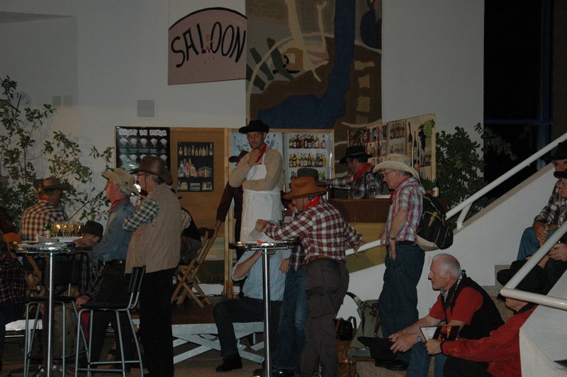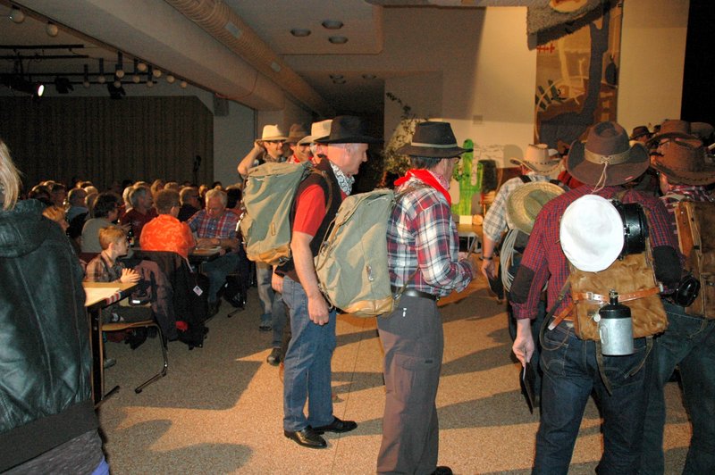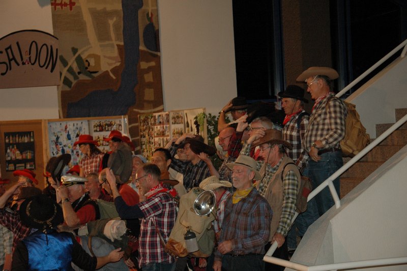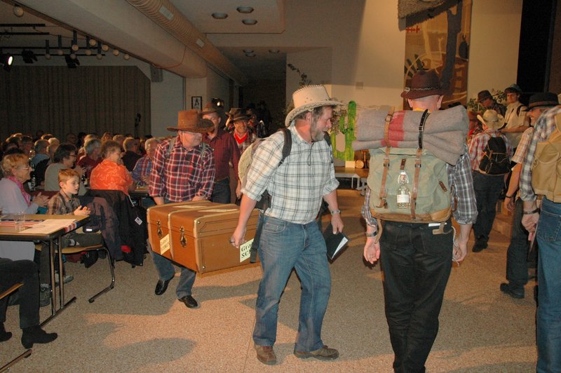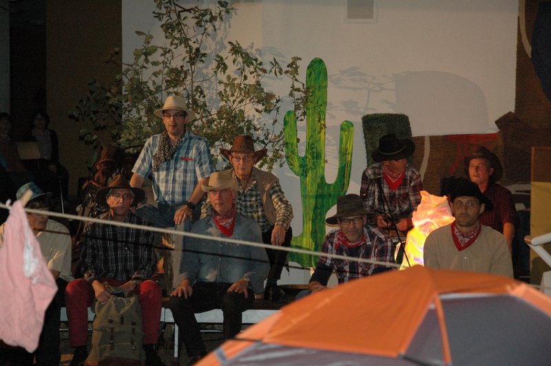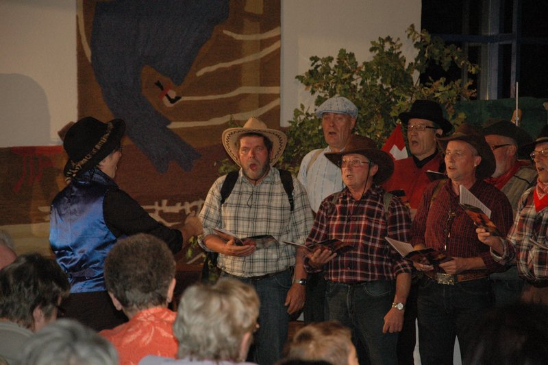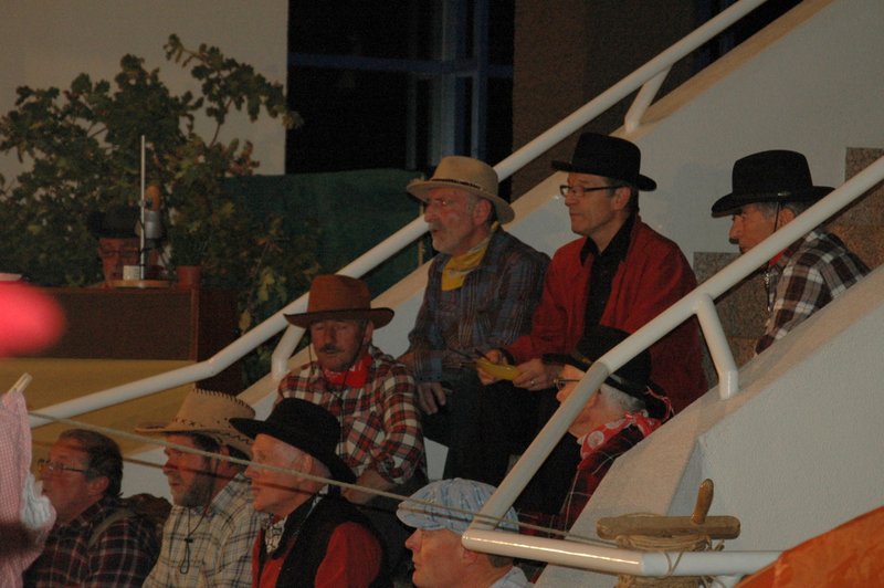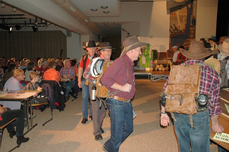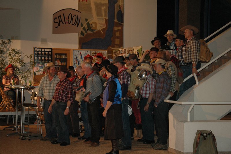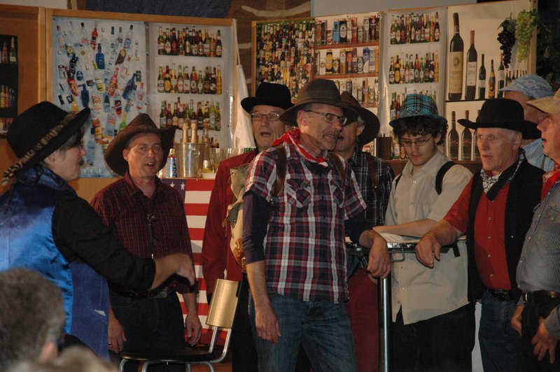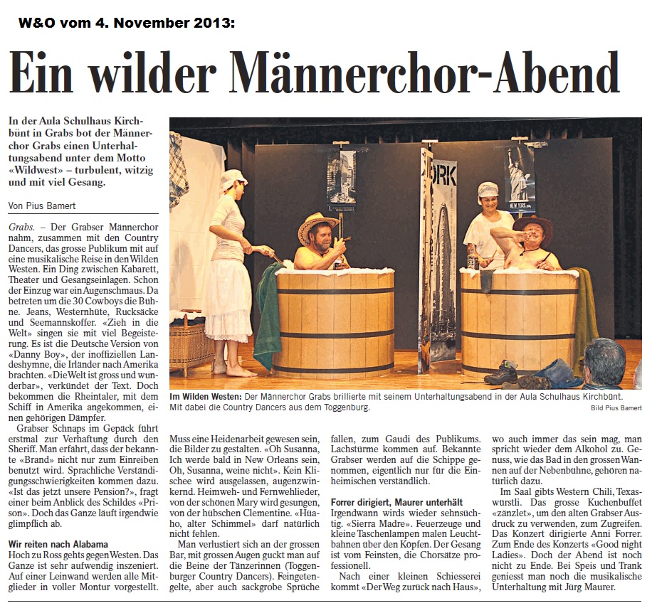 "Wildwest" - Singspiel des Männerchors Grabs  Die Grabser Männerchörler gehen auf Reisen, nach Amerika in den "Wilden Westen". Nicht mit dem Flugzeug, wie dies heute Mode ist, sondern in altbewährter Manier mit dem Schiff. Doch schon bei der Ankunft in der Neuen Welt gibts die ersten Probleme mit den Gesetzeshütern, sei es wegen des Grabserschnapses im Gepäck, oder sei es wegen missverstandener Streiche im Hafenviertel. Dann ziehts die Männer weiter in den Westen. Hoch zu Pferd gehts durch die Prärien, übernachtet wird am Lagerfeuer, und hin und wieder wird im Saloon abgestiegen für einen Drink oder zu einer Show mit den Country Dancers. Natürlich wird auf dieser Reise auch viel gesungen. Bald naht jedoch der Tag der Heimkehr, die letzten Dollars werden noch für Drinks ausgegeben, und das Schiff bringt die Gesellschaft wieder zurück nach Haus.  |