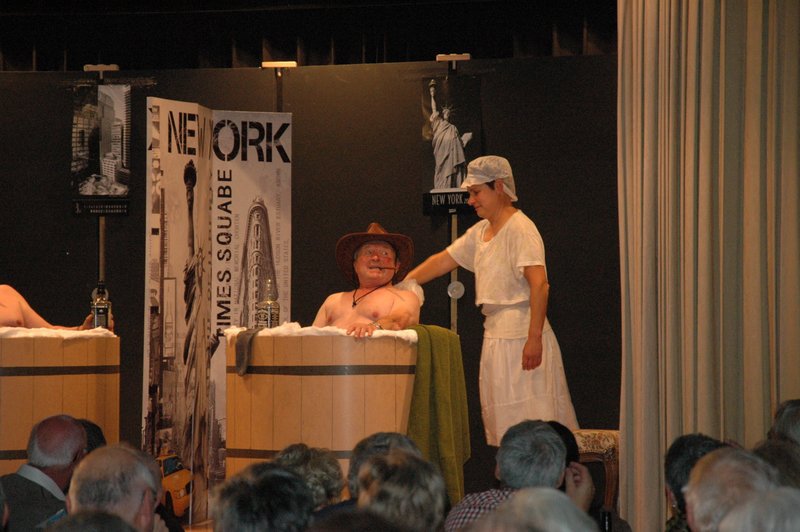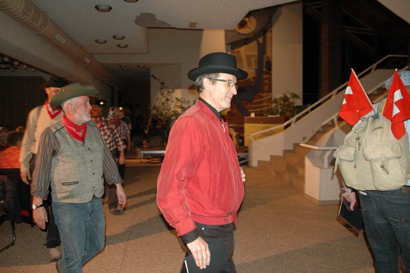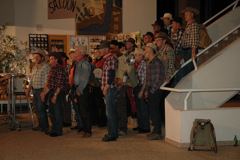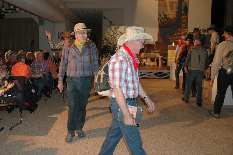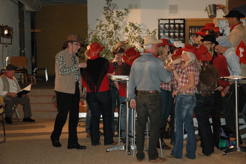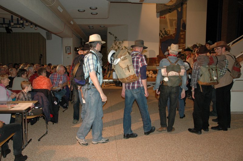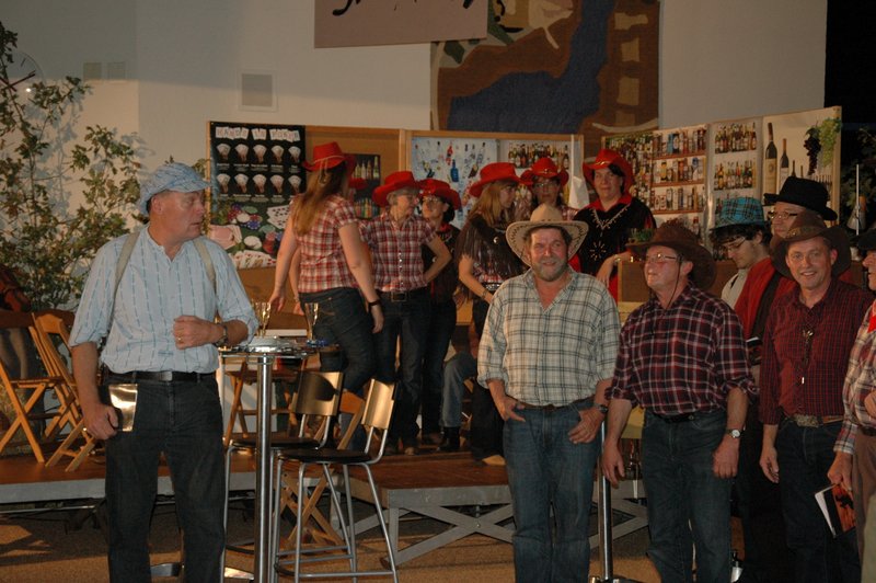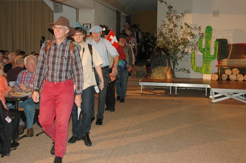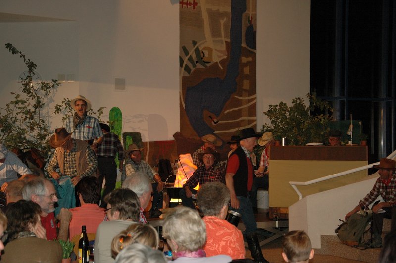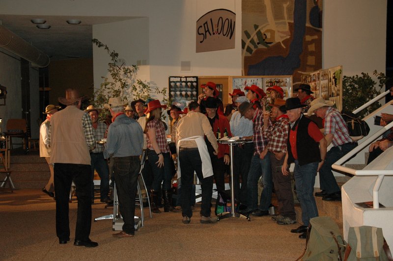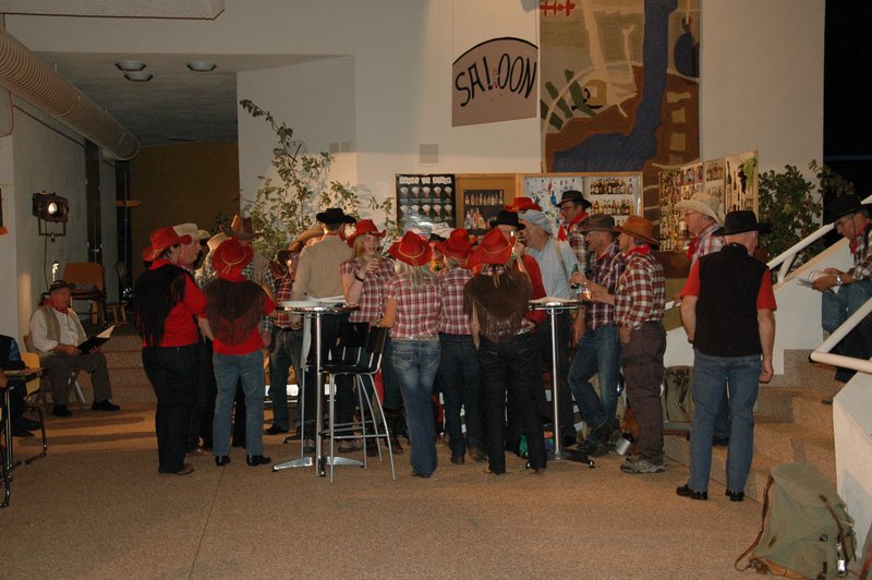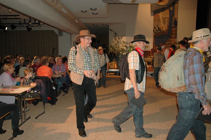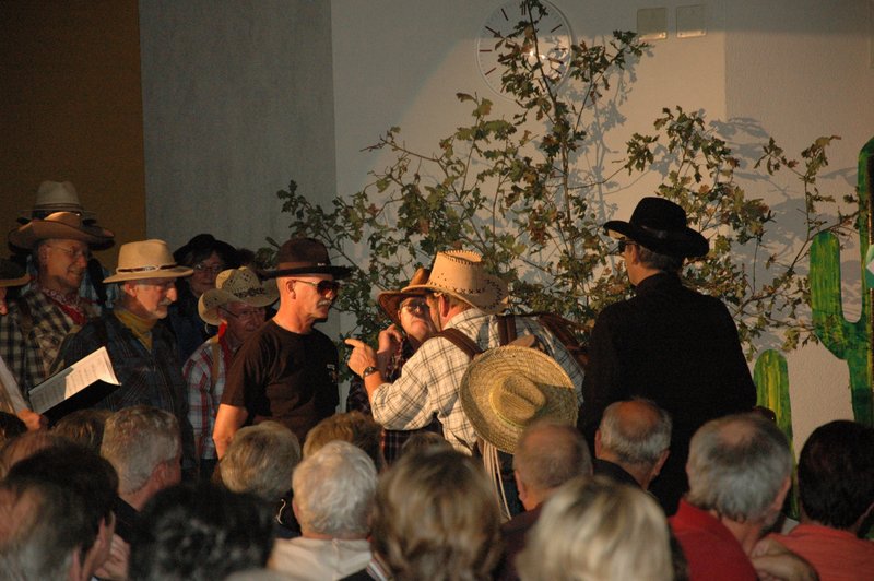 "Wildwest" - Singspiel des Männerchors Grabs  Die Grabser Männerchörler gehen auf Reisen, nach Amerika in den "Wilden Westen". Nicht mit dem Flugzeug, wie dies heute Mode ist, sondern in altbewährter Manier mit dem Schiff. Doch schon bei der Ankunft in der Neuen Welt gibts die ersten Probleme mit den Gesetzeshütern, sei es wegen des Grabserschnapses im Gepäck, oder sei es wegen missverstandener Streiche im Hafenviertel. Dann ziehts die Männer weiter in den Westen. Hoch zu Pferd gehts durch die Prärien, übernachtet wird am Lagerfeuer, und hin und wieder wird im Saloon abgestiegen für einen Drink oder zu einer Show mit den Country Dancers. Natürlich wird auf dieser Reise auch viel gesungen. Bald naht jedoch der Tag der Heimkehr, die letzten Dollars werden noch für Drinks ausgegeben, und das Schiff bringt die Gesellschaft wieder zurück nach Haus.  |