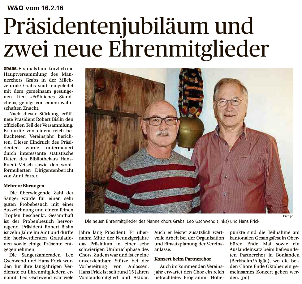 Die Sängerkameraden Leo Gschwend und Hans Frick wurden für ihre langjährigen Verdienste zu Ehrenmitgliedern ernannt. Leo Gschwend war 7 Jahre lang Präsident und übernahm in den 90er Jahren das Präsidium in einer sehr schwierigen Umbruchsphase. Zudem war und ist er immer eine wertvolle Stütze bei der Organisation von Anlässen. Hans Frick ist seit rund 15 Jahren Vorstandsmitglied und Aktuar. Auch er leistet wertvolle Arbeit bei der Organisation der Anlässe. Herzliche Gratulation an die beiden!